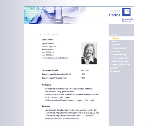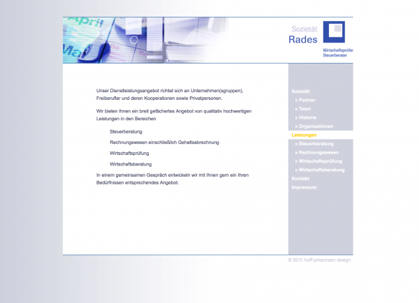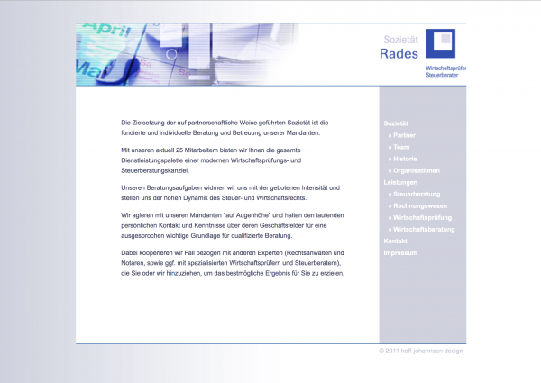 Veröffentlicht am 5. Mai 200426. Oktober 2021Internet | Sozietät Rades Entwurf, Gestaltung und Umsetzung der Internetpräsenz „sozietaet-rades.de“ für die Sozietät Rades
